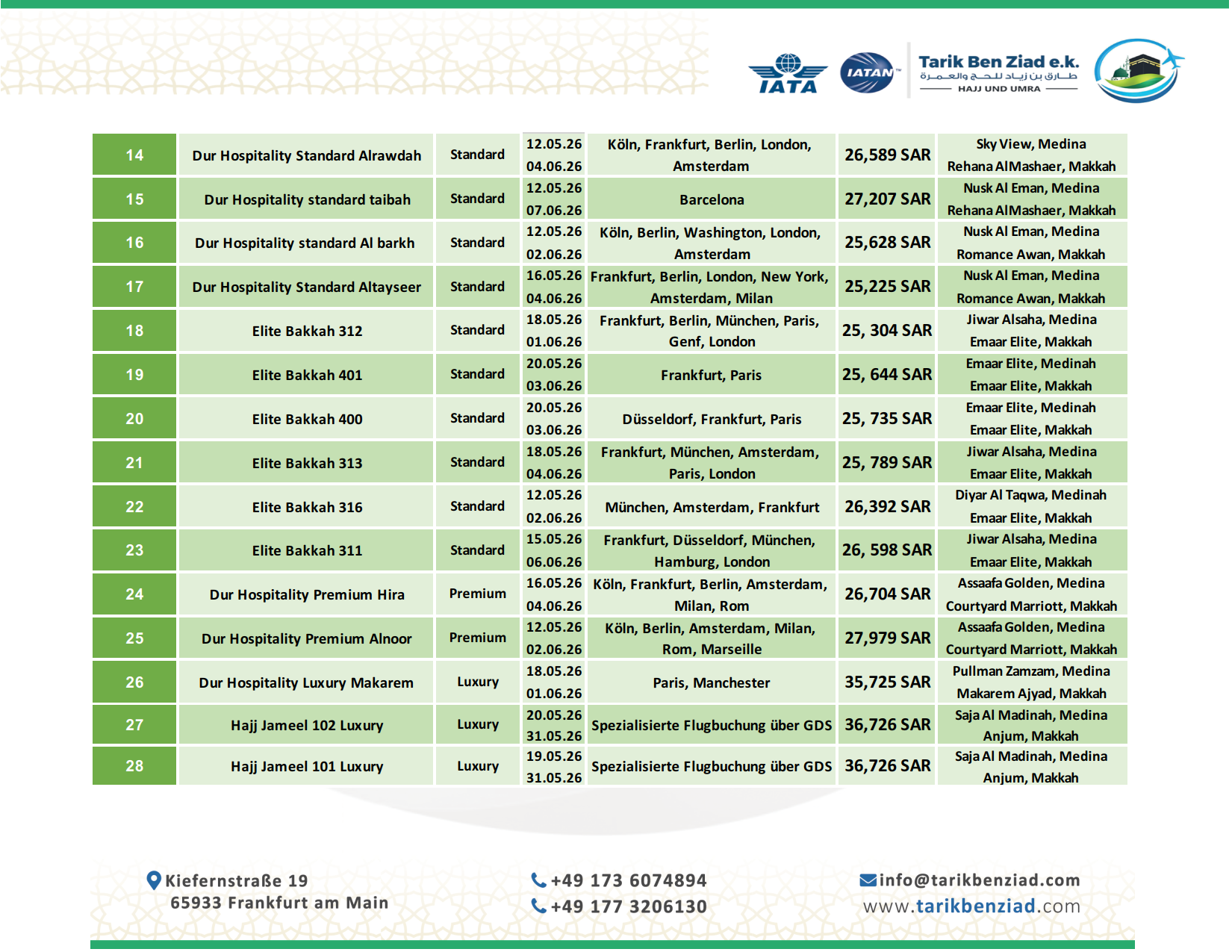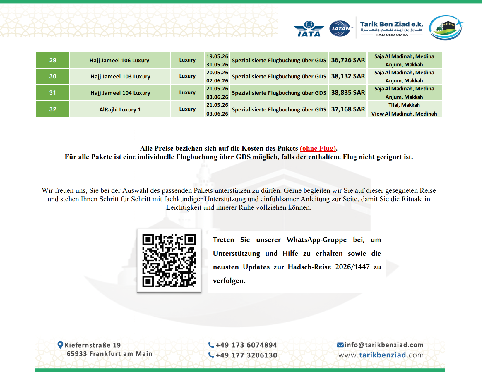 wir freuen uns, Sie bei der Tariq Bin Ziyad Hajj & Umrah GmbH – Deutschland begrüßen zu dürfen und Sie auf unseren Hadsch-Paketen für das Jahr 2026 begleiten zu können.