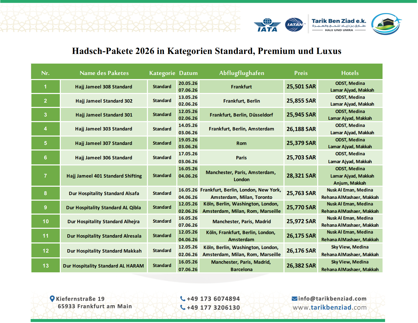 wir freuen uns, Sie bei der Tariq Bin Ziyad Hajj & Umrah GmbH – Deutschland begrüßen zu dürfen und Sie auf unseren Hadsch-Paketen für das Jahr 2026 begleiten zu können.